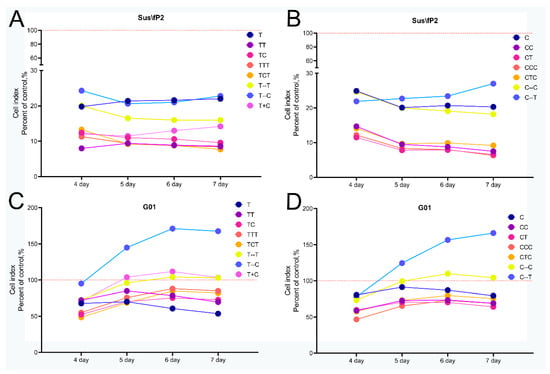 Sequential addition of two aptamers (variations TT, TC, CC, and CT) was found to have the most effective antiproliferative effect on Sus\fP2 culture; triple addition of any combination of the aptamers (TTT, TCT, CCC, CTC) did not yield any advantages. Furthermore, interruptions in the addition of aptamers resulted in diminished effects compared to a single addition (T-T, T-C, C-C, C-T). Simultaneous addition of aptamers (T + C) had a significant antiproliferative effect, but at the same time the cell index began to increase on day 7 of observation (Figure 7A,B).