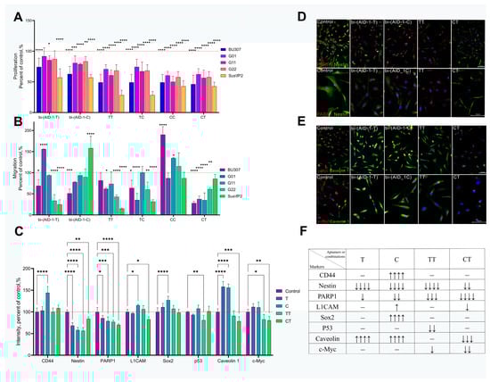 In light of this, the combined use of bi-(AID-1-T) and bi-(AID-1-C) in the variations of double addition of bi-(AID-1-T) (TT variation) and sequential addition of bi-(AID-1-T) and bi-(AID-1-C) (CT variation) not only demonstrated a significant antiproliferative and anti-invasive effect but also resulted in the downregulation of Nestin, PARP1, Caveolin-1, and c-Myc (Figure 8D,E), which can be clearly interpreted as a positive prognostic indicator.