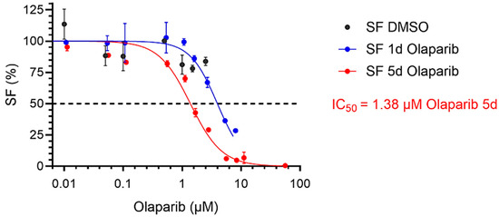 To determine the PARPi concentration for the combination experiments, the PC-3 cells were treated with Olaparib at concentrations ranging from 0.01 to 50 µM for one day or five days incubation periods. The chemotoxicity of the drug was evaluated using the clonogenic survival assay. At a concentration of 1 µM Olaparib and a treatment period of 5 days, the survival fraction was reduced to a SF value of 70.03 ± 2.5% compared to untreated control cells. This indicates moderate chemotoxicity at this concentration. The IC50, i.e., the inhibitory concentration required to reduce cell survival by 50%, was 1.38 µM after 5 days of incubation with Olaparib; the corresponding IC50 value for the incubation period of 24 h was 3.97 µM (Figure 1).