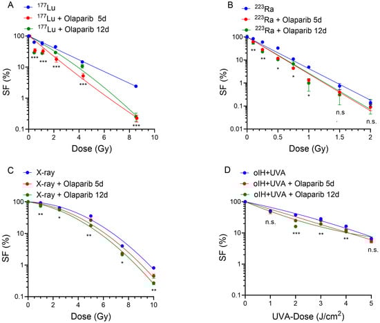 Olaparib treatment for 5- or 12-days sensitized PC-3 cells to different radiation qualities. Survival curves of single and combined treatment experiments with Olaparib and (A) 177Lu (B) 223Ra, (C) X-rays and (D) oIH + UVA are shown. Results are expressed as mean SF ± SD. Statistically significant differences are plotted in the graph, *** p < 0.0001, ** p < 0.001, * p < 0.01. Asterisks and brackets indicate significant differences for 5 days of Olaparib treatment in response to irradiation alone at p < 0.05, n.s. = not significant. Curves are fitted by the Linear Quadratic Model (LQM), linear (B) or linear quadratic (A,C,D) curve fits, GraphPad 10.2.3.403.