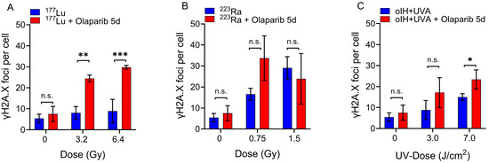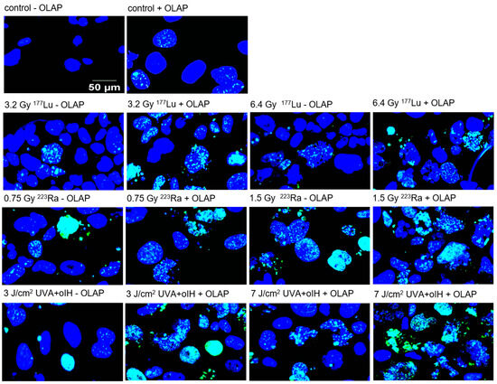 To evaluate the effect of Olaparib on the DSB processing, the PC-3 cells were irradiated with 177Lu, 223Ra or UVA light in combination with oIH to determine whether or not, the addition of 1 µM Olaparib has a radiosensitizing effect on the cells (Figure 3).