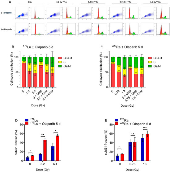 Overall, 177Lu monotherapy induced the migration of cells in the S phase, whereas 223Ra induced mainly G2/M arrest. Additional treatment with Olaparib only slightly increased these effects.
