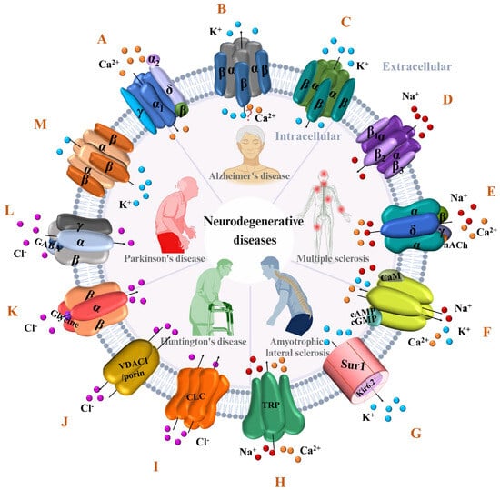 The major ion channels associated with neurodegenerative diseases: (A) voltage-gated calcium channel, (B) calcium-activated potassium channel, (C) inward-rectifier potassium channel, (D) voltage-gated sodium channel, (E) nicotinic acetylcholine receptor, (F) cyclic nucleotide-gated ion channel, (G) ATP-sensitive potassium channel, (H) transient receptor potential channel, (I) voltage-gated chloride channel, (J) mitochondrial voltage-dependent anion channel-1, (K) glycine receptor, (L) γ-amino butyric acid receptor, (M) voltage-gated potassium channel.