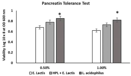 The ability of probiotics to survive in the upper gastrointestinal tract and tolerate pancreatic juice indicates their probiotic properties. The growth kinetics of test probiotic isolates were determined by measuring the absorbance after 24 h of incubation (Figure 1). E. lactis combined with (0.1 mg/108 CFU E. lactis) demonstrated superior tolerance to a 0.5% pancreatin solution compared to E. lactis alone. The HPL group exhibited a tolerance of 0.721 ± 0.05 × 108, whereas the E. lactis group demonstrated a tolerance of 0.67 ± 0.04 × 108. These results were significantly similar to L. acidophilus strains (0.82 ± 0.04 × 108) (Figure 1).