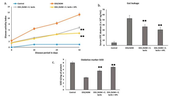 Effect of E. lactis oral administration on the DAI of the AOM/DSS-treated C57BL/6J mice (n = 6). The mice were divided into two groups: Group 1 served as the control group, and Group 2 was the treatment group. Mice received a single intraperitoneal (i.p.) injection of AOM (10 mg/kg) and subsequently received 2.5% DSS in their drinking water for one week, followed by two weeks of regular drinking water for recovery; this treatment cycle was repeated three times. Group 3 received DSS/AOM with E. lactis 108), while Group 4 received DSS/AOM with E. lactis and HPL at a dosage of 1 mg/100 g body weight. (a) DAI was scored for DSS/AOM mice with a 32-day disease period. (b) The study displays the gut leakage (FITC-dextran assay) in a dextran sulfate solution (DSS)-induced colitis mouse model, a representative IBD model. Mice body weight; (c) SOD activity was measured in units per milligram of protein (U/mg protein). The data present the mean ± standard deviation (SD). Asterisks denote the significance of E. lactis and HPL + E. lactis versus the AOM/DSS group, as determined by one-way ANOVA (** p < 0.01).