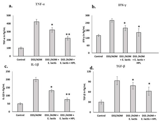 E. lactis inhibits DSS-induced inflammation in the colon of mice. Colon tissue pro-inflammatory cytokine (a) TNF-α, (b) IFN-γ, (c) IL-1β, and (d) TGF-β contents, detected by ELISA. The treatment conditions include DSS/AOM with and without E. lactis, as well as DSS/AOM with E. lactis in conjunction with HPL. Data for all quantifications (mean ± SD) were derived from the specified number of independent experiments and analyzed using a two-way ANOVA (* p < 0.05 vs. the control group and the DSS/AOM-induced colitis-associated group; ** p < 0.01 vs. the control group and the DSS/AOM-induced colitis-associated group).