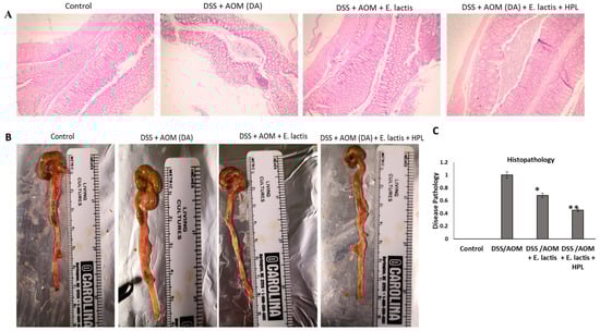 E. lactis effect on DSS-induced colitis symptoms in a mouse model. The treatment conditions include DSS/AOM with and without E. lactis, as well as DSS/AOM with E. lactis combined with HPL. On day 32 of the experiment, a representative photograph and statistical analysis of colon length were conducted. H&E staining of representative histological sections of colons from the groups (200× magnification). (A) The colon and histopathology scores show representative changes in histology. Low Mag: Scale bars, 20 μm. (B) The macroscopic examination of DSS/AOM with and without E. lactis and DSS/AOM with E. lactis with HPL colon. (C) The histological score was calculated as described in Methods. H&E staining was performed. For all quantifications, the data (mean ± SD) were from the indicated number of independent experiments and analyzed using a one-way ANOVA (* p < 0.05 vs. the DSS/AOM disease group; vs. the DSS-induced colitis group * p < 0.05 vs. ** p < 0.01).