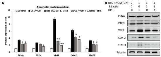 E. lactis reduces the expression of apoptotic protein markers in the colons of mice with DSS-induced colitis. The treatment conditions include DSS/AOM with and without E. lactis, as well as DSS/AOM with E. lactis in combination with HPL. Colon tissues were excised following a duration of 35 days of disease. (A,B) Analysis of PCNA, PTEN, VEGF, COX-2, and STAT-3 protein marker levels in the colon, along with quantification data. Data for all quantifications (mean ± SD) were derived from the indicated number of independent experiments and analyzed with a one-way ANOVA. * p < 0.05, compared to the DSS/AOM disease group (* p < 0.05, ** p < 0.01).