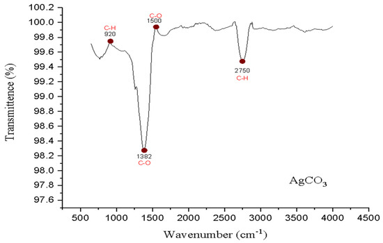 The FTIR spectrum of Ag2CO3 nanoparticles shows some intense peaks that clearly identify functional groups present in the nanoparticles. The two sharp peaks at 1382 cm−1 and 1500 cm−1 can be ascribed to C-O bonds present in the carbonate group, which is similar to findings by Pan et al. [] in Ag2CO3 nanocomposites with photocatalytic applications. The 920 cm−1 peak is attributed to C-H bending and the 2750 cm−1 peak to C-H stretching, which implies the presence of organic residues or surface modifications, as pointed out by Rabchinskii et al. [], where carbon–hydrogen peaks are attributed to surface changes. Furthermore, the appearance of these peaks is confirmed by Ebrahimi et al. [], who identified Ag2CO3-based nanocomposites using FTIR, stressing the role of functional groups in the FTIR spectra of the nanoparticles. Altogether, these results confirm the presence of carbonate groups and possible surface changes in the Ag2CO3 nanoparticles.