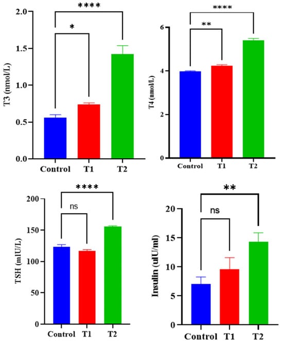 The concentration of circulating T3, T4, TSH, and insulin was estimated using Enzyme-linked Immunosorbent Assay (ELISA) kits (Sigma-Aldrich (Merck) Darmstadt, Germany). These hormone levels were then compared between the treated groups and the control in order to compare the metabolic loading of the treatment. The hormone scores were compared between the groups to assess if there was a significant difference.