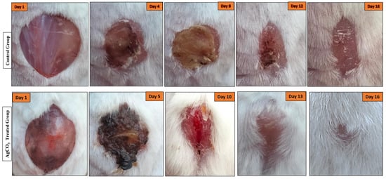 The data indicate that wounds treated with Ag2CO3 nanoparticles exhibit a significantly faster healing rate compared to the control group. Starting from day 2, the treated wounds show a more rapid reduction in wound size, with the healing process accelerating notably from day 5 onwards. By day 12, the treated wounds are nearly healed and, by day 13, complete healing is achieved. In contrast, the control group continues to show gradual wound closure, with complete healing not occurring until day 16. These results suggest that Ag2CO3 nanoparticles effectively enhance the wound healing process in diabetic conditions, potentially due to their antimicrobial properties and ability to promote tissue regeneration. This accelerated healing in the treated group highlights the potential therapeutic benefits of Ag2CO3 NPs in managing diabetic wounds, which are typically challenging to treat due to impaired healing mechanisms in diabetic patients (Figure 5 and Figure 6).