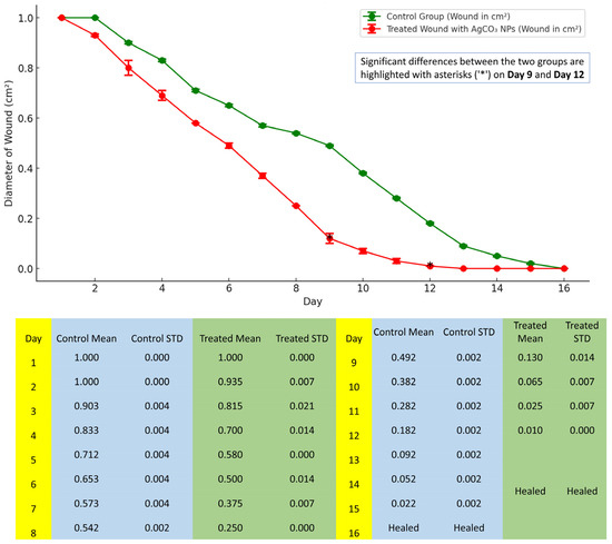 Graphical representation of wound healing progress between control and Ag2CO3-nanoparticle-treated diabetic wounds.