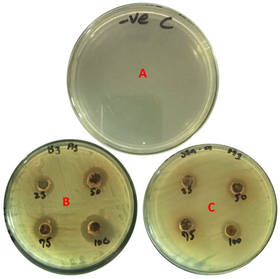Antimicrobial activity of Ag2CO3 nanoparticle against different bacterial strains: (A) Control; (B) Pseudomonas chengduensis; (C) Staphylococcus aureus.