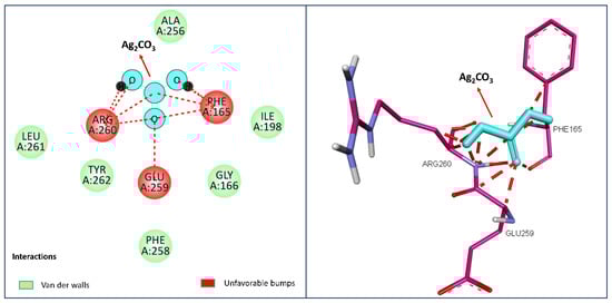 The molecular docking analysis presented highlights the interactions between Ag2CO3 and the thyroxine-binding protein (PDB). Records from this study portrayed the gene as 2CEO, which is known to have an important function in metabolism. The schemes at the left represent 2D depictions of the interaction between Ag2CO3 and the key amino acid residues for binding to thyroxine. Green-shaded residues, such as ALA256, ILE198, LEU261, PHE258, and TYR262, represent good van der Waals interactions that are crucial for the stabilization of the ligand in the active site and, thus, they adopted potential modulation of metabolic rate. Nonetheless, the residues colored in red (ARG260, GLU259, and PHE165) define steric or spatial hindrances expressed as “bad contacts” or “unfavorable bumps” that, potentially, lower the binding ability of Ag2CO3.