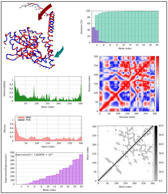 Figure 9 shows an iMODS validation chart related to the docking analysis, where the major interest is on the protein–ligand complex motion. Normal mode analysis used in the work is proved by the arrows in the top-left diagram, where the location of protein motion is described. This facilitates visualizing flexibility in the protein structure during the interaction process. The deformability graph, in the bottom left of the figure, represents areas of protein that are capable of changing their structures, as identified by peaks. The B-factor plot (middle left) is a graph of NMA-predicted flexibility (red line) against the flexibility as obtained from the PDB (grey bar plot), and alignment of the peaks on the two graphs indicates that the flexibility calculated by the NMA simulation was correct.