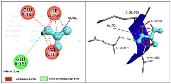 The molecular docking analysis between Ag2CO3 and thymidylate kinase (PDB: Protein P4GQQ) has functional domains that suggest interactions critical to understanding its function in the antimicrobial property. The 2D interaction diagram (left) also depicts no covalent link between the enzyme and the inhibitor; however, Ag2CO3 has a conventional hydrogen bond with GLU161 with a green dashed line, meaning that there is a stabilizing contribution from this source to the inhibition of the enzyme. Nevertheless, residues GLU165, ILE164, and VAL163 exhibited steric clashes, and the introduction of red dashed lines indicates that this is actually a detrimental factor that may weaken Ag2CO3 binding because there may be spatial hindrance.