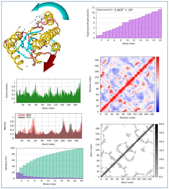 The B-factor plot (middle left) overlays the experimental B-factor derived from the PDB with the corresponding predicted values in NMA, and the closeness of the graphs about the same axis reflects the correlation between the experimental and computational data, further affirming the docking outcomes. The variance and eigenvalue plots at the top right and bottom left prove the contribution of each mode to the overall movement, and lower modes are highly significant in overall conformational changes.