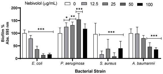 Biofilm formation is a refuge against different types of stressors, including noninheritable bacterial tolerance toward antibiotics [10,12]. Thus, we tested the effect of nebivolol on bacterial biofilm formation. E. coli and A. baumannii biofilms were sensitive to nebivolol in a dose-dependent manner. S. aureus biofilm was especially sensitive; however, no clear dose dependency was observed. In contrast, P. aeruginosa biofilm formation increased up to 50 µg/mL, and no significant difference was found between the biofilm of the untreated control and those treated with 100 µg/mL of nebivolol (Figure 2).
