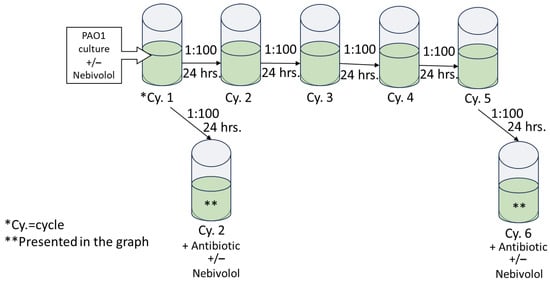 P. aeruginosa starter was diluted 1:100 and these cultures were grown continuously with nebivolol for 6 cycles (pre-exposed). At cycles 2 and 6, ciprofloxacin or tobramycin was introduced, and the O.D. at 600 nm was determined after 24 h. In addition, P. aeruginosa cultures were grown in the absence of nebivolol for 6 cycles; at cycles 2 and 6, nebivolol and tobramycin or ciprofloxacin were added (co-exposure) for 24 h; and the O.D. at 600 nm was determined. Nebivolol concentration was 100 µg/mL, and the control contained DMSO at 0.5%. The bacteria were diluted in LB (1:100) for each cycle in a new 96-well plate, and incubations were carried out at 37 °C statically for 24 h. The protocol is illustrated in Figure 4.