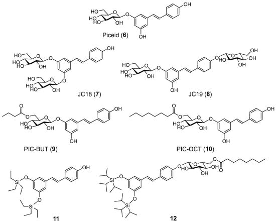 Valdés-Sánchez, L.; Moshtaghion, S.M.; Caballano-Infantes, E.; Peñalver, P.; Rodríguez-Ruiz, R.; González-Alfonso, J.L.; Plou, F.J.; Desmet, T.; Morales, J.C.; Díaz-Corrales, F.J. Synthesis and Evaluation of Glucosyl-, Acyl- and Silyl- Resveratrol Derivatives as Retinoprotective Agents: Piceid Octanoate Notably Delays Photoreceptor Degeneration in a Retinitis Pigmentosa Mouse Model. Pharmaceuticals 2024, 17, 1482. https://doi.org/10.3390/ph17111482