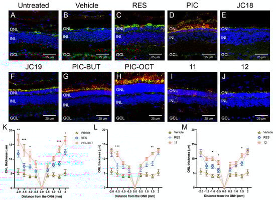 2.2.1. RES Derivative PIC-OCT (10) Preserves Efficiently Photoreceptors in rd10 Mice