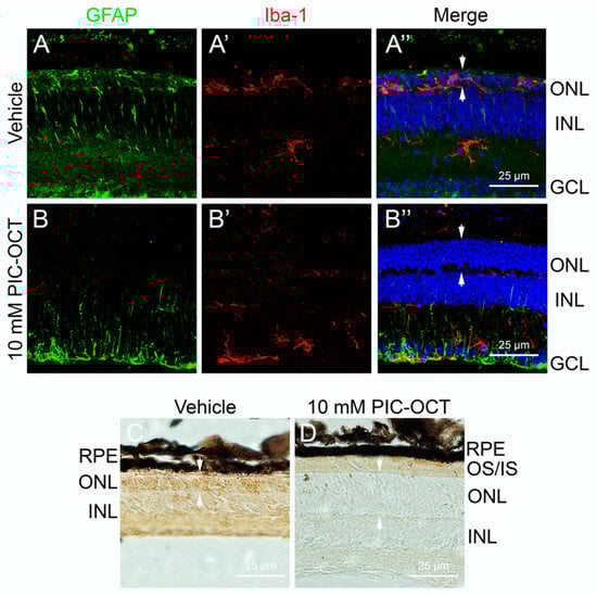 2.2.4. PIC-OCT Reduces Microglial Migration and PARP1 Expression in the rd10 Retina