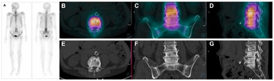 Example of conventional bone scintigraphy and SPECT/CT using the radiopharmaceutical 99mTc-MDP for primary staging of a prostate cancer patient (Gleason score 8). (A). Whole-body conventional images demonstrate abnormal uptake in the 3rd, 4th, and 5th lumbar spines. The abnormal uptake was equivocal for metastases. Therefore, the patient underwent SPECT/CT images. The fused axial (B), coronal (C), and sagittal (D) images demonstrate diffuse uptake in the lumbar spine with increased activity in areas consistent with degenerative processes, clearly seen in the CT images in the axial (E), coronal (F), and sagittal (G) planes. Therefore, the patient had degenerative processes and no osteoblastic bone metastases in this study.