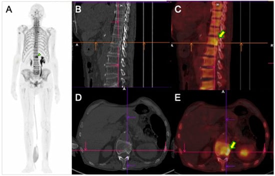 Example of PET/CT using the radiopharmaceutical 18F-fluoride of an 85-year-old prostate cancer patient. The patient underwent the study for restaging purposes (Gleason, 4 +3; post-prostatectomy and radiotherapy) due to biochemical recurrence (PSA = 323 ng/dL). (A). Whole-body MIP (Maximum Intensity Projection) image demonstrates a focal area of abnormal uptake in the 1st lumbar vertebrae (arrowhead). The sagittal in the CT and fused images in the sagittal (B,C) and axial (D,E) images demonstrate increased activity in areas consistent with osteoblastic bone metastasis (yellow arrows).