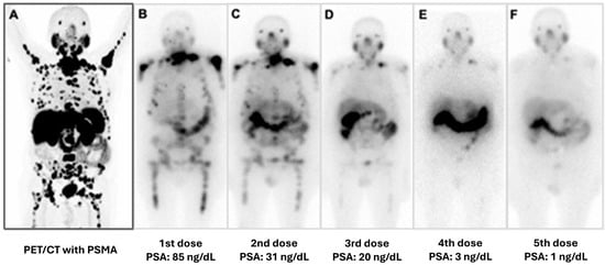 PSMA PET/CT allows the selection of suitable patients for treatment with corresponding PSMA-labeled radiopharmaceuticals, such as lutetium-177 (177Lu-PSMA) and actinium-225 (225Ac-PSMA), as shown in Figure 1.