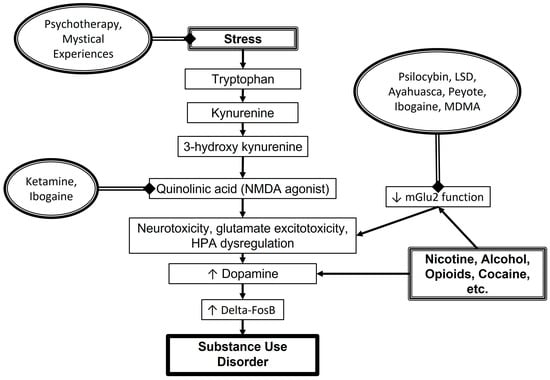 A variety of substances may lead to addiction, from alcohol to opiates to stimulants. As measured by the 2023 NSDUH and defined by the Diagnostic and Statistical Manual of Mental Disorders, 5th edition, an individual may be diagnosed with an SUD based on the following criteria: the substance is recurrently taken, often in larger amounts than intended, despite its use resulting in professional, social or interpersonal problems; efforts to decrease or quit using the substance are unsuccessful, and/or more of the substance is required to achieve the desired effect; and physical and/or psychological withdrawal symptoms occur when use is stopped for a period of time [,]. While the specific mechanisms of action by which a substance lends itself to abuse are slightly variable, the overarching mechanism is that the substance interacts with the reward circuit, stress circuit, and/or decision-making circuits within the brain []. Use of a substance can stimulate the dopaminergic reward system, specifically leading to the transcription and accumulation of Delta-FosB within the neurons of the nucleus accumbens (nAC) and dorsal striatum [,,]. In addition to the direct positive reinforcement from the reward circuit, the ways in which an individual responds to stress can increase the potential for drug-seeking behavior via the hypothalamus–pituitary–adrenal (HPA) axis. Although stress can create positive feelings of accomplishment or adaptability in the short term, chronic stress can lead to sustained activation of the HPA which indirectly increases dopamine release and the accumulation of Delta-FosB []. The inflammation caused by physiological and psychological stress is known to switch the breakdown of tryptophan off of production of serotonin and towards kynurenine []. Kynurenine is then metabolized to the N-methyl-D-aspartate (NMDA) agonist quinolinic acid, which leads to neurotoxicity, enhanced HPA dysregulation and glutamate excitotoxicty []. Indeed, glutamate imbalance has been implicated in the development of SUDs, with the metabotropic glutamate receptor 2 (mGlu2) in the prefrontal cortex (PFC), nAC and mesocorticolimbic systems exhibiting decreased function with chronic drug exposure []. This glutaminergic dysfunction has been shown to alter the reward pathways and increase addictive behaviors. Overall, activation of these systems can create cravings for the initiating substance, and the absence of that substance can lead to symptoms of withdrawal (Figure 1).