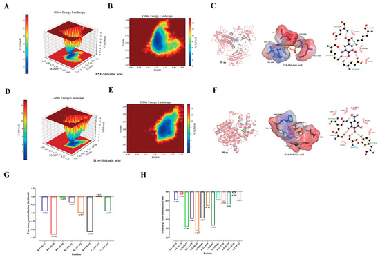 2.3.2. Gibbs Free Energy Analysis and Free Energy (MM/PBSA) Analysis