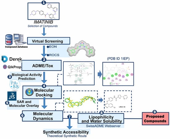 Ligand-based virtual screening was performed using the reference compound imatinib, due to its crystallography being defined for tyrosine kinase antiproliferative activity (PDB ID: 1IEP) in three commercial compound databases (ChemBridge-DIVERSet, ChemBridge-DIVERSet-EXP, Zinc_Drug Database, Zinc_Natural_Stock, Zinc_FDA_BindingDB and Maybridge), using the ROCS (Rapid Overlay of Chemical Structures) program v. 3.6.2.0, by screening using shape similarity. This screening resulted in a total of 2000 structures per database, totaling 12,000 structures based on the pivotal compound. The structures obtained by ROCS screening were subjected to a new virtual similarity screening based on electrostatic affinity with the pivot molecule, imatinib, using the EON program, v. 3.0.0.0. This provided the “Top100” per database, resulting in 600 structures that advanced to pharmacokinetic and toxicological predictions.