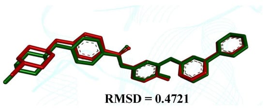 According to the literature, the binding mode prediction using docking should present an RMSD value lower than 2.0 Å in the crystallographic pose of the ligand [,,,,]. Therefore, these results with the methodological proposal using these parameters are satisfactory. We emphasized in our previous study the use of molecular docking tools to search for new potential leads or hits [,,,,].