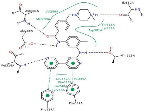 Figure 3 shows the molecular docking results for imatinib (PDB ID 1IEP), with interaction sites around the alpha-helix (residues Leu348 to Glu286-Met290) and the beta-sheet (residues Tyr253-Val256, Thr315-Met318, Ile360, Leu370, and Ala380-Phe382). Hydrogen bonds were observed with residues Glu286, Thr315, Met318, Ile360, and Asp381, supporting data from literature studies [].