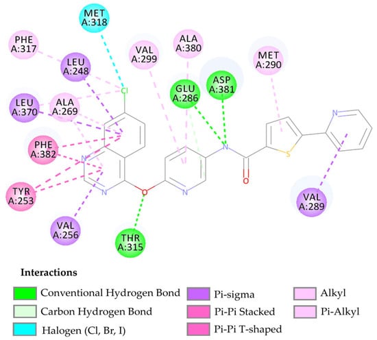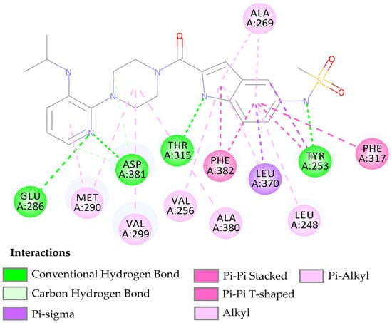The compound LMQC04 presented a binding affinity value close to imatinib (−12.2 Kcal mol−1); in relation to the others, this was the most satisfactory result. It presented three hydrogen interactions with Thr315, Glu286 and Asp380, four pi-sigma interactions with the amino acids Leu248, Leu370, Val256 and Val289, five π-alkyl interactions with Phe317, Val299, Ala380, Met290, and Ala269, and finally, two pi-pi interactions paired with Phe382 and Tyr253, totaling 14 interactions (see Figure 5 and Figure S2 in the Supplementary Materials).