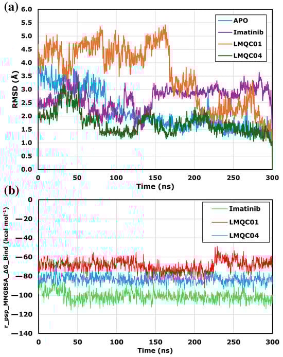 In Molecular Dynamics (MD), the dynamic behavior of a molecular system is simulated to assess protein-ligand complex stability. MD simulations were performed using the Desmond module of Schrödinger, and the resulting trajectories were analyzed with the Simulation Interaction Diagram. Figure 6a shows the protein’s Root Mean Square Deviation (RMSD), indicating conformational changes in the complex compared to the apo-protein. The LMQC01 complex presented higher RMSD values in the first 168 ns in comparison to the other complexes studied, and presented lower RMSD values, remaining stable in the last 132 ns. Although the LMCQ01 complex deviates from the apo-protein, the maximum difference was about 3.6 Å. The imatinib and LMQC04 complexes remained stable, with RMSD changes under 2.2 Å throughout 300 ns. Since all protein–ligand complexes showed stable RMSD values, MM-GBSA binding energy was used for further analysis.