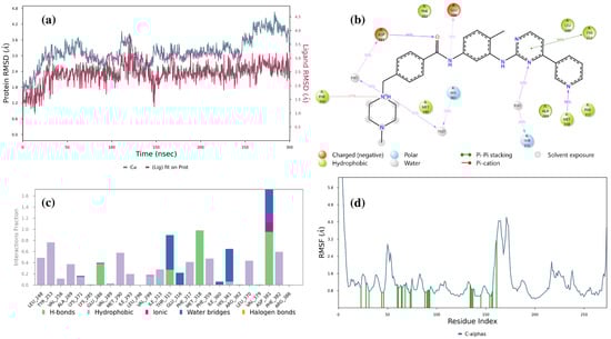 Result of 300 ns MD analysis for imatinib binding to the Abl-kinase domain. The protein–ligand RMSD plot of imatinib bound to the Abl-kinase domain (a) (PDB ID: 1IEP). Ligand–protein contact interactions scheme with the protein residues of imatinib bound to Abl-kinase (b). Protein–ligand contacts histogram of the interaction fraction of H-bond (green), hydrophobic bond (purple), ionic bond (magenta), and water bridges (blue) for imatinib (c). RMSF plot of imatinib (d) protein–ligand complex.