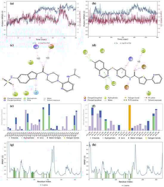 RMSF plots show each protein residue’s flexibility during the simulation; lower values indicate rigidity, while higher values indicate flexibility. Our RMSF data (Figure 8g,h) reveal the protein’s dynamic behavior upon ligand binding.