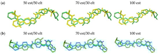 The overlay results showed that both molecules have a similarity of 41 to 50 est (50% steric contribution), see Table 5. For 70 est and 100 est (70% steric contribution and 100% steric contribution, respectively) there was a very small variation in the values obtained. The values ranged from 57% to 58% for 70 est and 82% to 83% for 100 est (see Table 5).