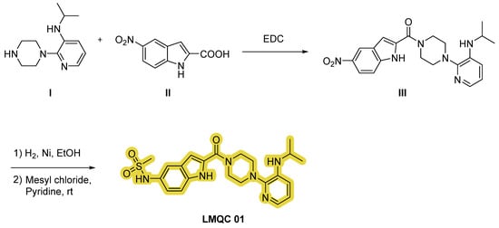 Compound LMQC 01 can be synthesized according to the procedure carried out by O. S. Pedersen et al. []. A coupling reaction between piperazine I and indole carboxylic acid derivative II using 1-ethyl-3-(3-(dimethylamino)propyl)carbodiimide (EDC) as activating agent will produce intermediate III.