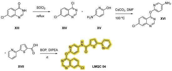 Compound LMQC 04 can be obtained by a method reported in previous work of E. S. Leal et al. [] (Figure 12). Treatment of quinazoline derivative XIII with excess of thionyl chloride (SOCl2) under reflux conditions will originate double chlorinated quinazoline XIV. Secondly, nucleophilic reaction between intermediate XIV and aminopyridinol XV using cesium carbonate (CsCO3) as a base and DMF as solvent will give derivative XVI. Lastly, the target carboxamide LMQC 04 will be obtained by amidation with carboxylic acid XVII moderated by DIPEA and 1-benzotriazolyl-oxytris-(dimethylamino)phosphonium-hexafluoro-phosphate (BOP) as coupling reagents.