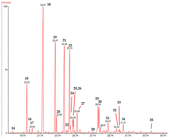 Expanded GC-MS chromatogram of the essential oil from the dry leaves of V. tweediana. In the selected region, 18–36 min are the major constituents of the essential oil. Peaks are assigned with entries 14–34.