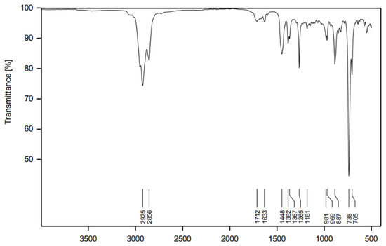 Pure samples provided a spectrum typical of hydrocarbons with a certain degree of unsaturation (Figure 2). Absorptions at 2925 cm−1 and 2856 cm−1 refer to the Csp3-H stretching vibrations, and those at 1448 cm−1, 1382 cm−1 and 1357 cm−1 are Csp3-H bend vibrations. The very weak bands at 1633 cm−1 and just above 3000 cm−1 might be associated with Csp2-H vibrations, which are comparably less intense due to the low degree of unsaturation in the sample. The presence of C=C bonds is further evidenced by the intense absorption at 738 and 705 cm−1, referring to the =C-H out-of-plane bending.