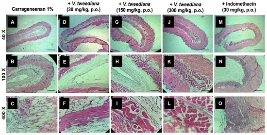 Air pouches were induced in the dorsal subcutaneous tissue of Swiss mice. Illustrative figures of air pouches tissues obtained from animals treated orally with (A–C) vehicle, (D–F) V. tweediana 30 mg/kg, (G–I) V. tweediana 150 mg/kg, (J–L) V. tweediana 300 mg/kg, (M–O) Indomethacin 30 mg/kg one hour before the injection of 2 mL of carrageenan (1%). Representative H.E. histological sections of skin biopsies obtained from mice with air pouches (40, 100, and 400×). Scale bar = 100 μm.