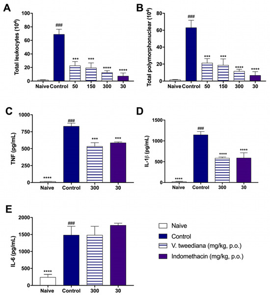 In addition to reducing cell counts in the exudate, V. tweediana extract at a dose of 300 mg kg−1 also decreased the levels of TNF and IL-1β compared to carrageenan-injected mice, as shown in Figure 4C,D. Indomethacin-treated animals exhibited similar results. However, neither the essential oil nor indomethacin influenced IL-6 production, as demonstrated in Figure 4E.