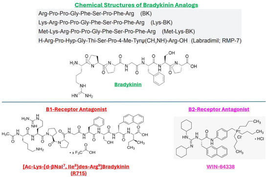 - Regoli, D.; Gobeil, F.; Nguyen, Q.T.; Jukic, D.; Seoane, P.R.; Salvino, J.M.; Sawutz, D.G. Bradykinin receptor types and B2 subtypes. Life Sci. 1994, 55, 735–749. [Google Scholar] [CrossRef]