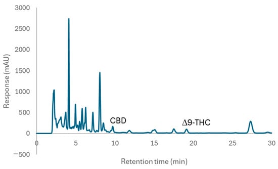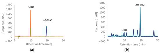 The chromatograms of standard CBD and Δ9-THC following sonication closely resembled the initial standard solutions, with no degradation peak observed, as shown in Figure 2. These findings suggest that both standards maintained good stability under the extraction conditions. Consequently, this extraction method is considered suitable for isolating CBD and Δ9-THC from sample matrices for regulatory applications, as it facilitates a relatively rapid extraction process without compromising the integrity of the target analytes.