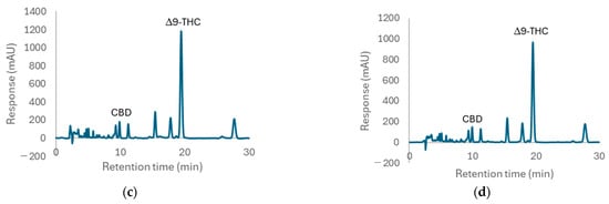 Dichloromethane, in conjunction with green solvents such as ethyl acetate and ethanol, was selected as the solvent for the extraction of Δ9-THC and CBD from the combined leaves and inflorescences of the cannabis sample. This selection aimed to optimize the yield of CBD in the extract. A mixture of solvent and herbal powder was prepared at a ratio of 10:1, subjected to centrifugation, and subsequently extracted using ultrasonic extraction for 30 min, with temperature control maintained at or below 30 degrees Celsius. The extraction process was repeated three times consecutively, and the combined extracts were analyzed using HPLC-PDA, which has been modified from the method established by Analakkattillam et al. [21]. The chromatograms for standard CBD (retention time = 9.89 min) and standard Δ9-THC (retention time = 19.53 min), detected at 208 nm, are illustrated in Figure 1a,b. The chromatograms for the extracted samples are presented in Figure 1c,d. The peak areas of Δ9-THC and CBD extracted using different solvents are summarized in Table 4. The dichloromethane extract exhibited the highest peak area (peak area CBD = 2185 and Δ9-THC = 25,793), demonstrating its effectiveness as determined by HSPs. In contrast, the extracts obtained using ethyl acetate (peak area CBD = 1628 and Δ9-THC = 19,262) and ethanol (peak area CBD = 1959 and Δ9-THC = 23,037) exhibited lower concentrations compared to those extracted with dichloromethane.