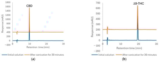 Chromatograms of the initial standard solution and the solution after sonication for 30 min for (a) CBD and (b) Δ9-THC.