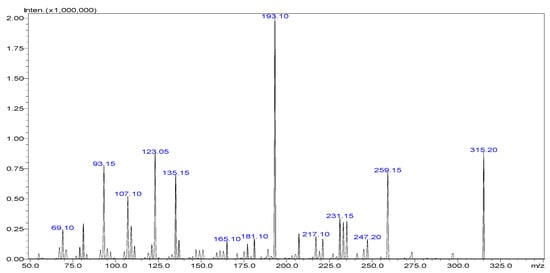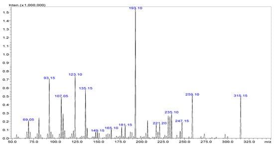 The precursor ions selected for Δ9-THC and CBD typically correspond to the protonated molecular ions ([M + H]+) generated in the electrospray ionization (ESI) source. Fragmentation of these precursor ions in the collision cell of the mass spectrometer results in the generation of specific product ions characteristic of each analyte. Δ9-THC and CBD have a molecular weight of 314.45 g mol−1 and show a similar precursor to product ion transitions (315 > 123, 193, and 259), as shown in Figure 4, Figure 5 and Figure 6. Multiple reaction monitoring (MRM) transitions were optimized for the quantification of Δ9-THC and CBD.
